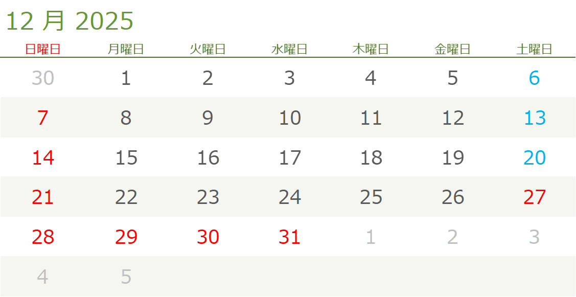 2025年12月営業日カレンダー お知らせ 2025.12.01 12月の営業日カレンダーです。 週末は午前中の半日営業を行います。(配達は月曜日以降に実施いたします。) 赤文字は休業日です。 年内の営業は26日までとさせていただきます。 本年もご愛顧誠にありがとうございました。 戻る ホームお知らせ2025年12月営業日カレンダー 採用情報 Recruit
