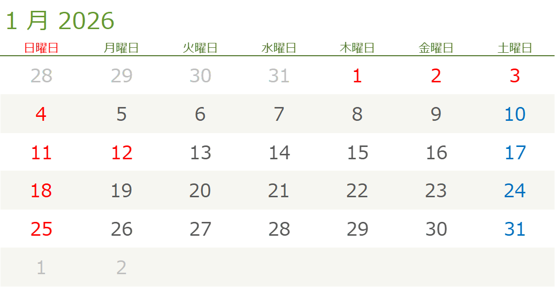2026年1月営業日カレンダー お知らせ 2026.01.01 新年明けましておめでとうございます。旧年中は格別のご愛顧を賜り、誠にありがとうございました。 本年も、皆さまに信頼されるサービスの提供と、一層の業務改善に努めてまいります。変わらぬご支援を賜りますよう、よろしくお願い申し上げます。 2026年1月の営業カレンダーです。(赤=休業日 青=半日営業日 黒=通常) 皆さまのご健康とご多幸を心よりお祈り申し上げます。 戻る ホームお知らせ2026年1月営業日カレンダー 採用情報 Recruit