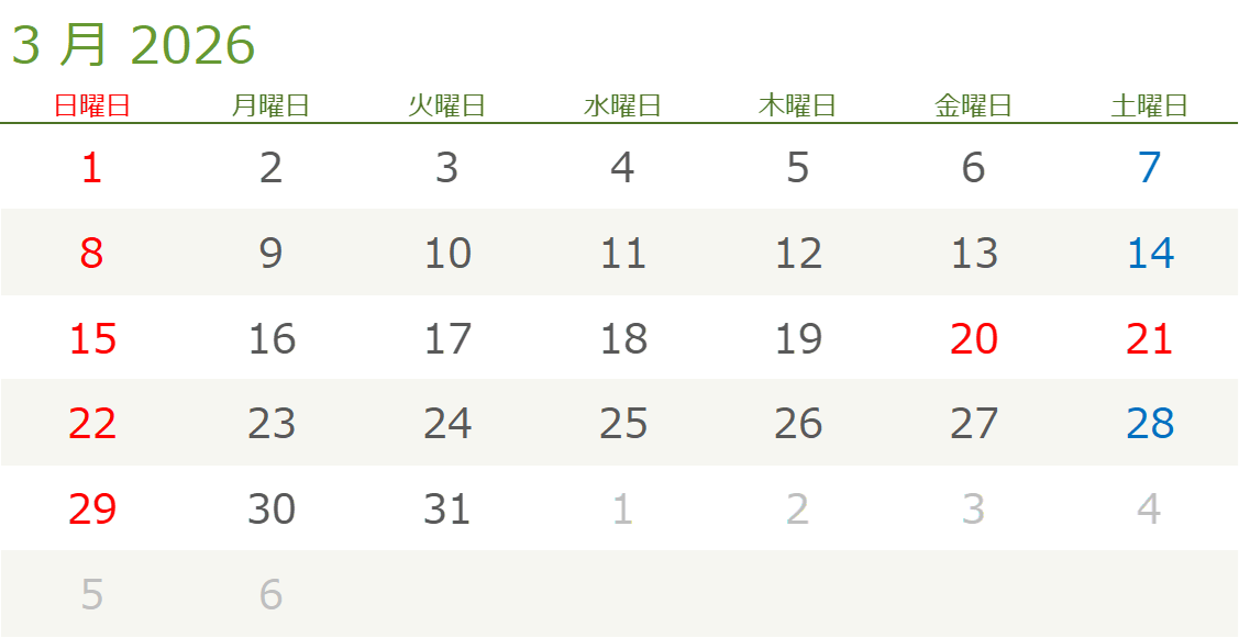 2026年3月営業日カレンダー お知らせ 2026.03.01 2026年3月の営業カレンダーです。(赤=休業日 青=半日営業日 黒=通常) 今月も変わらぬご愛顧のほど、よろしくお願い申し上げます。 戻る ホームお知らせ2026年3月営業日カレンダー 採用情報 Recruit
